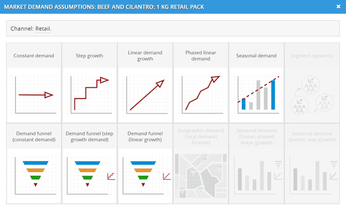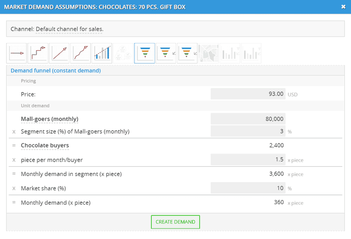 Log in to Decision Critical and enter the constructor for your chosen scenario by clicking on the name of the scenario. From there, select your product and click on the 'demand' block in your product card. Choose a channel and your preferred method for demand modeling and you are set to go.