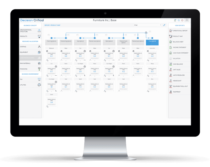 The product map shows the production process from the beginning to the end, with key information such as the raw materials and semi-finished products that go into each segment of production, as well as other important details such as step-by-step process times, power consumption, staff deployed and equipment utilized.
